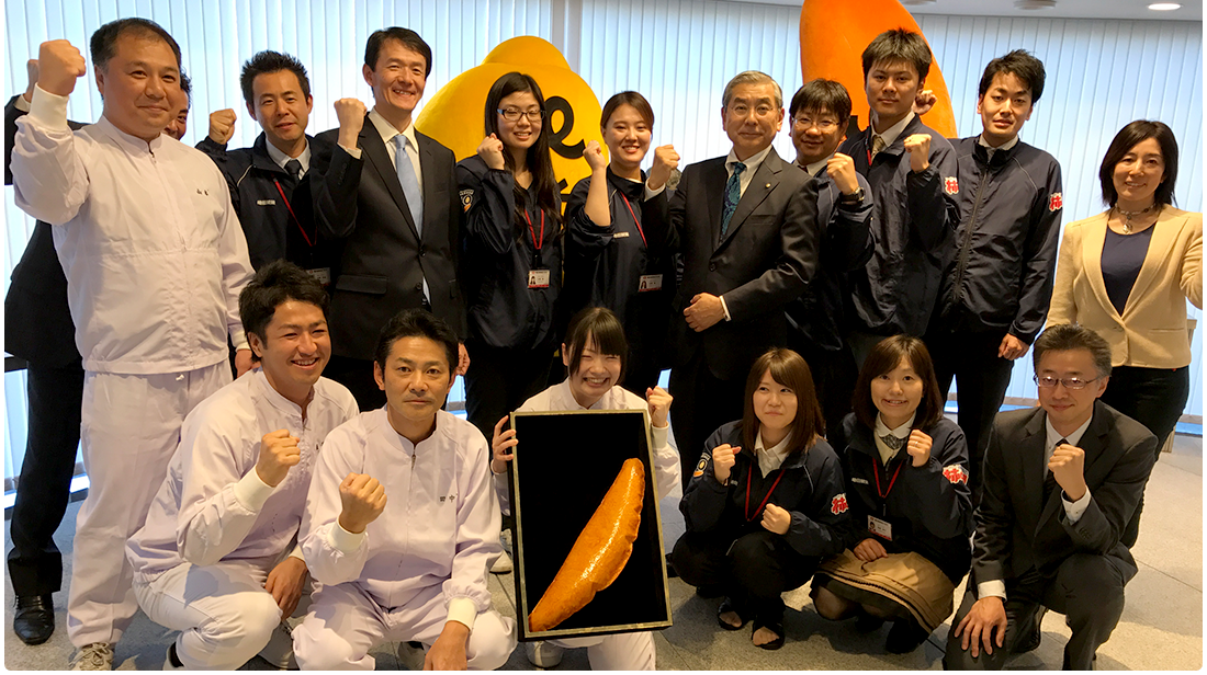 開発に挑戦したのは、亀田製菓の技術開発部の社員。日々「亀田の柿の種」をつくり続けている彼らでも、50cmを超えるものをつくるという挑戦はまったくの初めて。