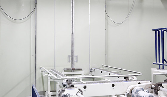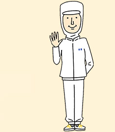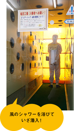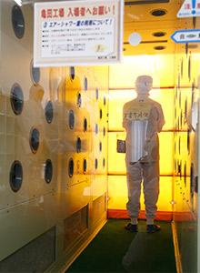 工場へ入るには、まず「エアーシャワー」で衣類についたホコリを取り除く。衛生管理は徹底。