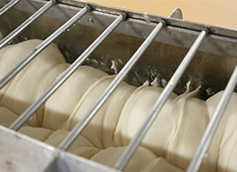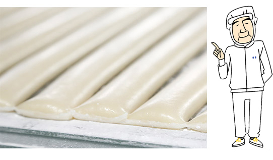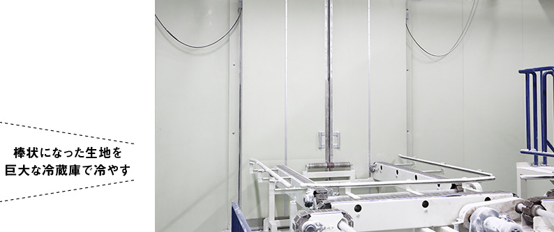 やわらかい生地はそのままでは切断できないため、冷蔵庫へ自動搬送し、24時間程寝かせる。十分に冷やすことで生地が硬くなり、一定の厚さで切断しやすくなる。