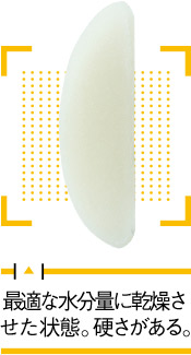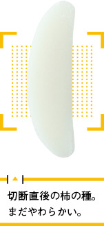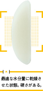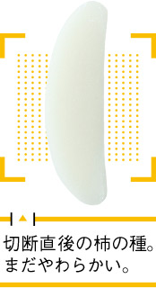 断面は柿の種の原型である半月型。生地の温度と水分のほか、重さによって半月型の高さや大きさが変わるので調整が必要。