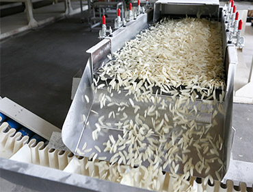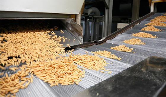 生地に残っている水分を適度に飛ばすため、2台の乾燥機にそれぞれ10分ほどかけて通し、温風で乾燥させる。その後、色彩選別機を通して、形が崩れたものを取り除く。
