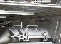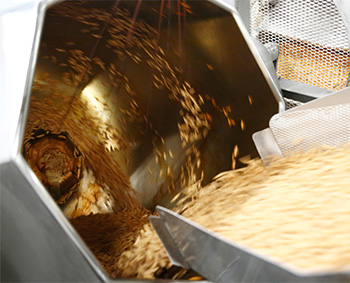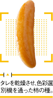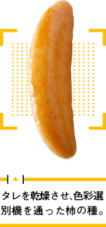 ドラムタンクに柿の種を入れ、回転させながら、しょうゆ・砂糖・その他の調味料でできた"秘伝のタレ"で味付けをする。その後に色彩選別機で規格外のものを取り除く。