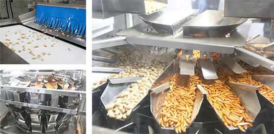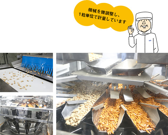 ピーナッツがここで登場!重量が柿の種7:ピーナッツ3の比率になるように、それぞれをコンピュータースケールで計量し、個包装する。