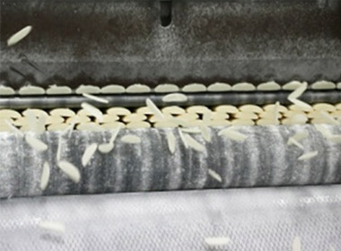 冷蔵庫で冷やされた生地を、高速カッターで薄く一定の厚さに切っていく。その数1秒間におよそ1,500粒。切断面の厚さは約1.6mm。焼くときのふくらみ、そして食感に関わる。