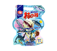 おさかながいっぱいのかわいいパッケージにたこ焼ソース風味、ほたてバター風味、しおシャケ風味の3種類が入った柿の種アソートです。