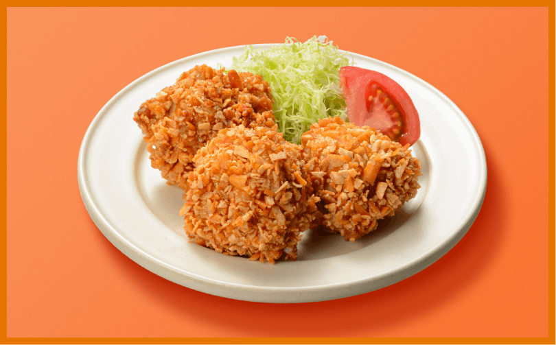 亀田の柿の種・・・30g / 鶏もも肉・・・3枚塩・・・少々 / 酒・・・少々 / 小麦粉・・・ 10g卵白・・・ 10g / 揚げ油・・・適量 キャベツ・・・30g / トマト・・・15g