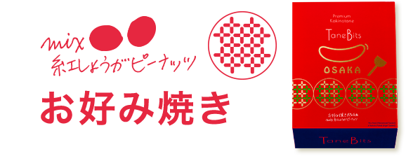 | お好み焼きmix紅しょうがピーナッツ | 衣がけピーナッツ(ピーナッツ(中国産)、小麦粉、砂糖、その他)、米粉(うるち米(国産))、でん粉、しょうゆ、ソース、砂糖、はっ酵調味料、植物油脂、魚介エキス調味料、食塩、粉末ソース、青のり、たん白加水分解物、こんぶエキス、あおさ、肉エキス調味料、乳糖、香辛料、粉末しょうゆ、オニオンエキス/調味料(アミノ酸等)、加工でん粉、香料、ソルビトール、膨脹剤、酸味料、着色料(カラメル、パプリカ色素)、香辛料抽出物、甘味料(ステビア、スクラロース)、(一部にえび・小麦・卵・乳成分・落花生・ごま・大豆・鶏肉・豚肉・もも・りんご・ゼラチンを含む) | 本品に含まれるアレルゲン(28品目中) えび・小麦・卵・乳・落花生・ごま・大豆・鶏肉・豚肉・もも・りんご・ゼラチン |