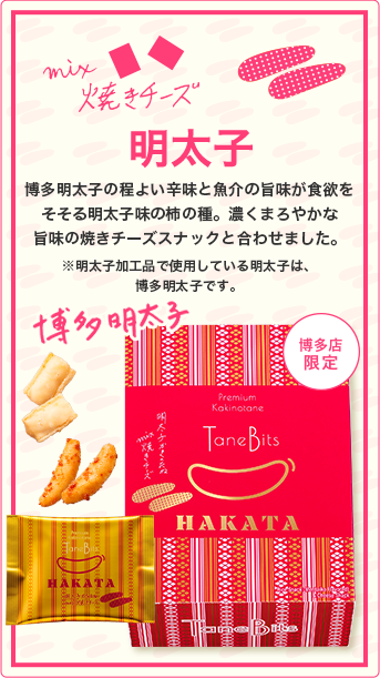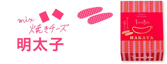 | 明太子mix焼きチーズ | 米粉(うるち米(国産))、でん粉、チーズ加工品(チーズ、たらすり身、その他)、明太子調味液(しょうゆ、砂糖、みりん、清酒、その他)、明太子加工品(でん粉、乳糖、食塩、ぶどう糖、水あめ、明太子エキス、香辛料、明太子、その他)、明太子風味シーズニング、植物油脂/調味料(アミノ酸等)、乳化剤、ソルビトール、香料、着色料(紅麹、カラメル、パプリカ色素)、香辛料抽出物、(一部に小麦・乳成分・さけ・大豆を含む) | 本品に含まれるアレルゲン(28品目中) 小麦・乳・さけ・大豆 |