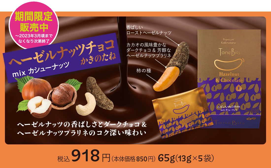 | ヘーゼルナッツチョコ mix カシューナッツ | カシューナッツ(カシューナッツ(インド産)、植物油脂、食塩)、チョコレート、ヘーゼルナッツパウダー、うるち米粉(国産)、でん粉、ヘーゼルナッツプラリネペースト、しょうゆ、砂糖、魚介エキス調味料、たん白加水分解物、こんぶエキス、食塩/植物レシチン、加工でん粉、調味料(アミノ酸等)、ソルビトール、香料、着色料(カラメル、パプリカ色素)、香辛料抽出物、(一部に小麦・卵・乳成分・アーモンド・カシューナッツ・大豆・鶏肉・豚肉を含む) | 小麦・卵・乳・アーモンド・カシューナッツ・大豆・鶏肉・豚肉 | 本品製造工場ではえび、落花生を含む製品を製造しています。 | 製造日より150日間 |