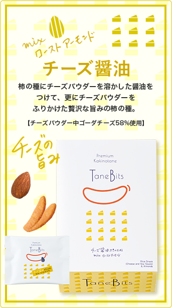 | チーズ醤油 | 米粉(うるち米(国産))、でん粉、しょうゆ、チーズパウダー、植物油脂、はっ酵調味料、砂糖、たん白加水分解物、水あめ、魚介エキス調味料、チキンエキス調味料、こんぶエキス調味料、食塩、酵母エキスパウダー、乳等を主要原料とする食品/加工でん粉、調味料(アミノ酸等)、ソルビトール、着色料(カラメル、パプリカ色素)、香料、香辛料抽出物、(一部に小麦・卵・乳成分・大豆・鶏肉・豚肉を含む) | 本品に含まれるアレルゲン(28品目中) 小麦・卵・乳・大豆・鶏肉・豚肉 |